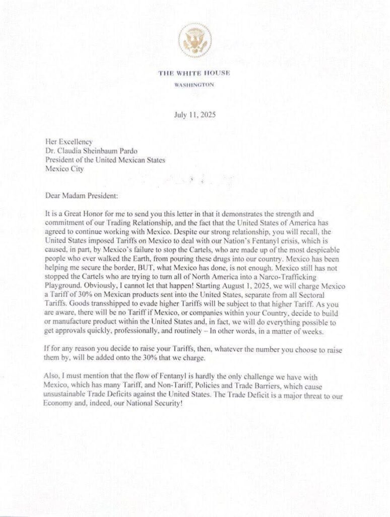 El presidente Trump compartió la carta que envió al gobierno mexicano para notificar sobre la imposición de arancel del 30 por ciento a partir del 1 de agosto.El presidente Donald Trump acusó que no se hizo lo suficiente para frenar el tráfico de fentanilo.
