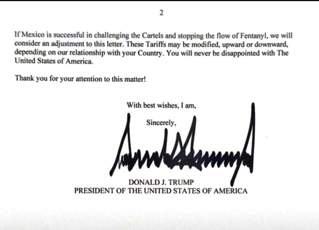 A través de una carta de Donald Trump a la presidenta Claudia Sheinbaum, el presidente de EU asegura que la imposición de aranceles a México responde a que nuestro país ha fallado en detener a los cárteles de la droga y en la lucha contra el tráfico de fentanilo.