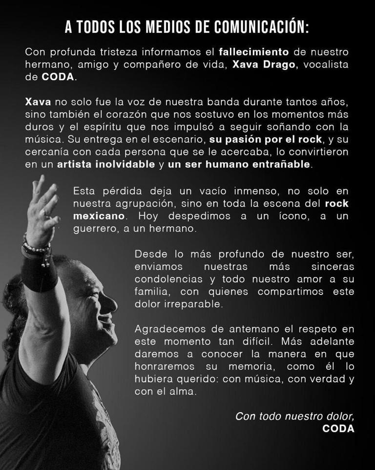 “Con profunda tristeza informamos el fallecimiento de nuestro hermano, amigo y compañero de vida, Xava Drago, vocalista de CODA. Xava no solo fue la voz de nuestra banda durante tantos años, sino también el corazón que nos sostuvo en los momentos más duros y el espíritu que nos impulsó a seguir soñando con la música”, dijeron.