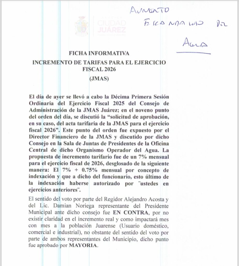 En su conferencia de prensa semanal, el alcalde explicó que en la última reunión del Consejo de la JMAS, los consejeros, incluyendo al presidente del organismo, Sergio Nevárez, aprobaron el aumento del servicio arriba del 7 por ciento mensual que supera con mucho el monto de la inflación que se espera sea alrededor del 4 por ciento.