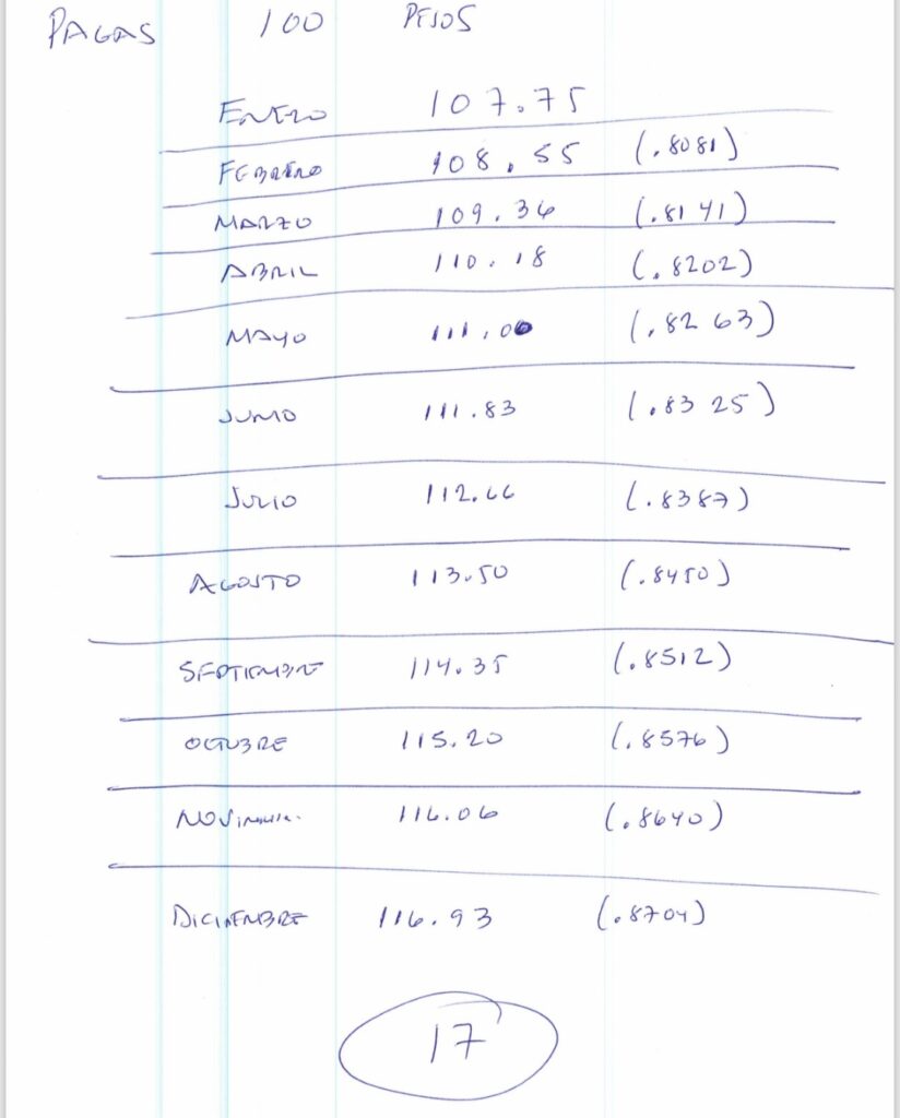 Citó como ejemplo un pago mensual de 100 pesos, que con la indexación del 7.5 por ciento, se pagan 107 pesos, pero al mes siguiente a esa cantidad se le agrega otro 7.5 por ciento y así sucesivamente cada mes.