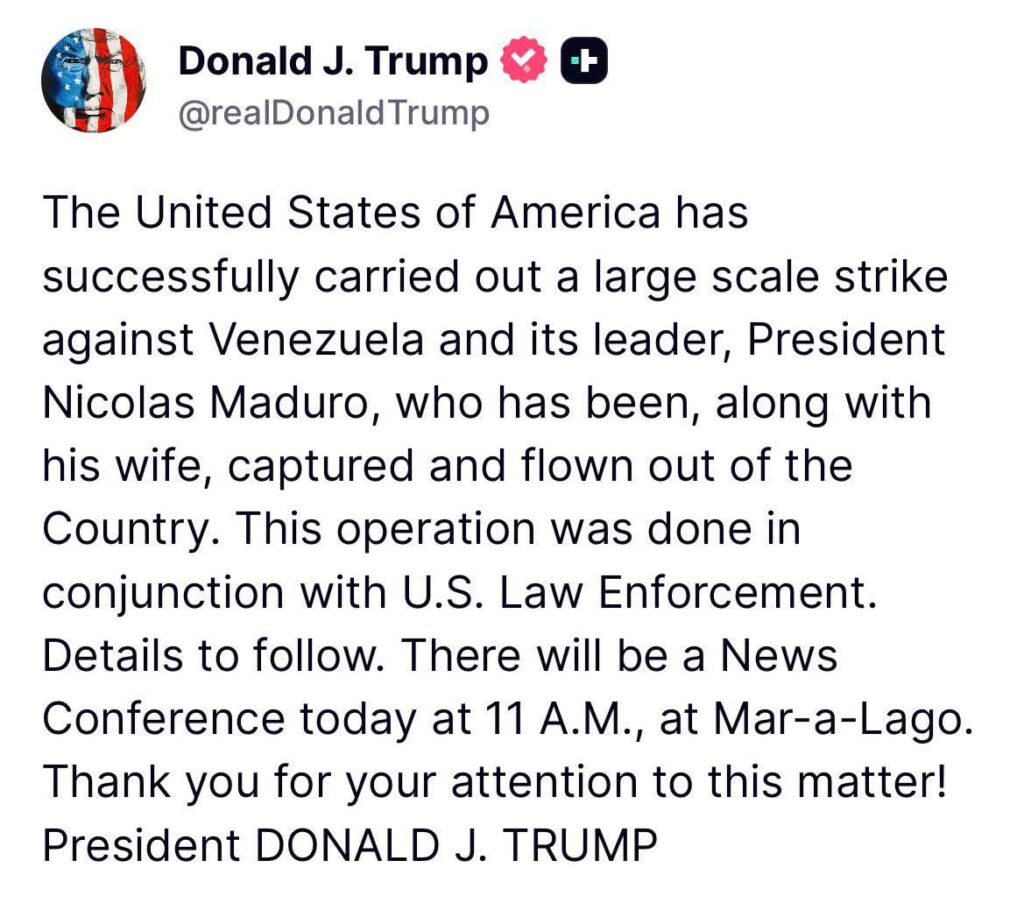 “Maduro fue capturado”: Trump afirma que Estados Unidos ejecutó operación con ataque a gran escala en Venezuela